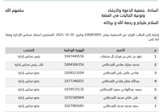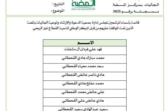 قائمة بأسماء المرشحين لمجلس إدارة جمعية الدعوة والإرشاد وتوعية الجاليات بالمضةالذين تمت الموافقة عليهم من قبل المركز الوطني لتنمية القطاع غير الربحي